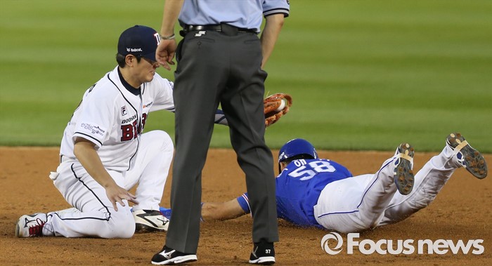 (서울=포커스뉴스) 20일 서울 잠실구장에서 열린 2016 프로야구 삼성-두산 경기 5회초 1사후 중전 안타로 진루한 삼성 박해민이 이승엽 타석때 2루 도루를 시도해 성공하고 있다.