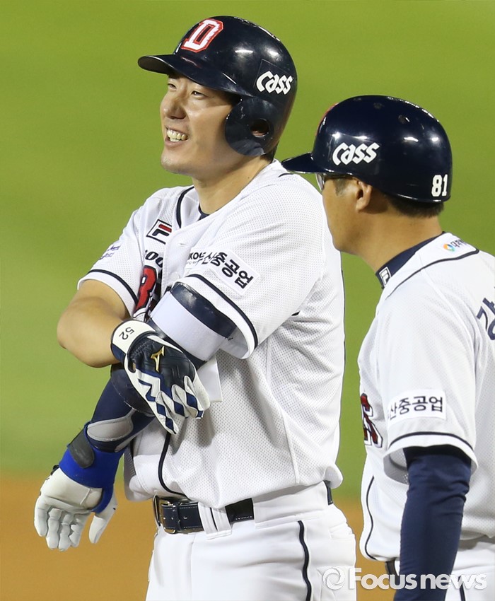 (서울=포커스뉴스) 20일 서울 잠실구장에서 열린 2016 프로야구 삼성-두산 경기 7회말 2사 2루에서 두산 김재호가 중전 적시타로 주자를 불러 들이고 1루에서 기뻐하고 있다.