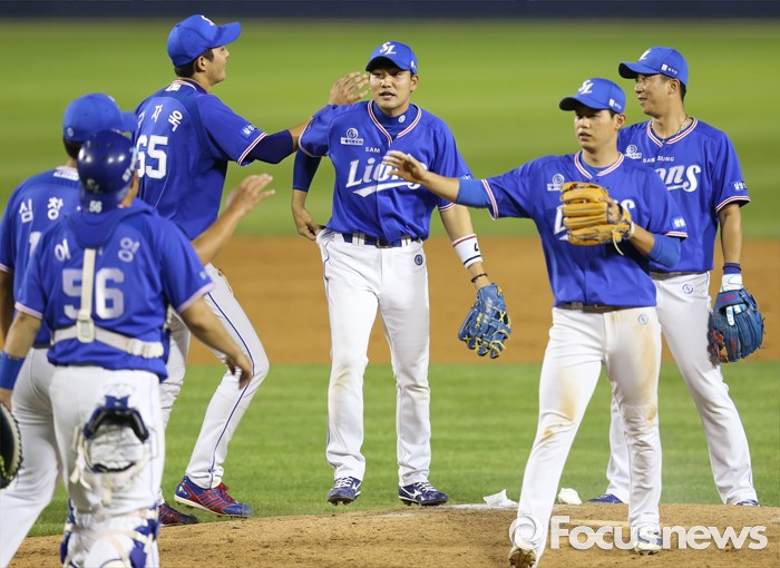 (서울=포커스뉴스) 20일 서울 잠실구장에서 열린 2016 프로야구 삼성-두산 경기에서 구자욱과 발디리스의 홈런 두 방으로 두산을 물리친 삼성 선수들이 마운드에 모여 승리의 기쁨을 함께하고 있다.
