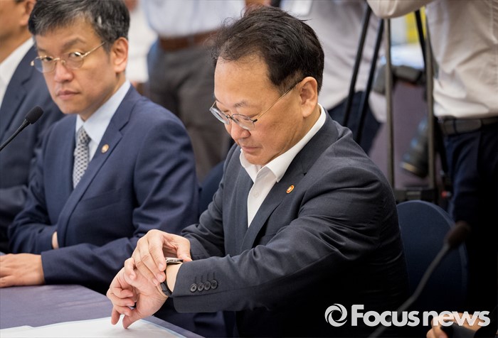 (서울=포커스뉴스) 21일 오전 서울 여의도 국회 귀빈식당에서 열린 2016년 세법개정 당정협의에 참석한 유일호 경제부총리 겸 기획재정부 장관이 시계를 보고 있다.
