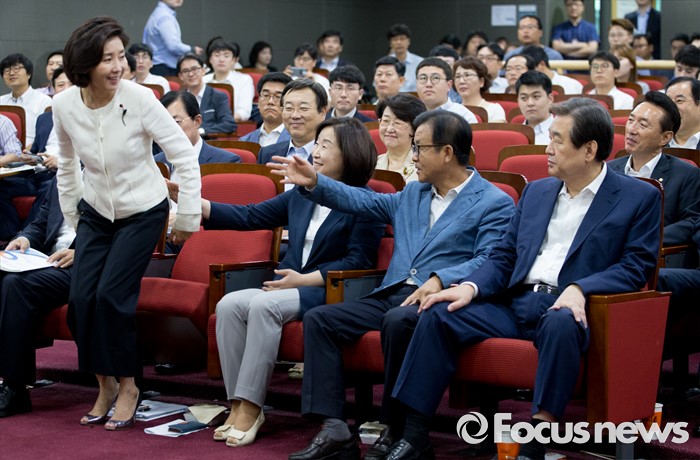 (서울=포커스뉴스) 21일 오전 서울 여의도 국회 의원회관에서 열린 퓨처라이프포럼 2기 출범식 및 세미나에 참석한 나경원 새누리당 의원이 축사를 위해 단상으로 향하고 있다. 왼쪽부터 나 의원, 포럼 공동대표인 심상정 정의당 상임대표, 원혜영 더불어민주당 의원, 김무성 새누리당 전 대표.
