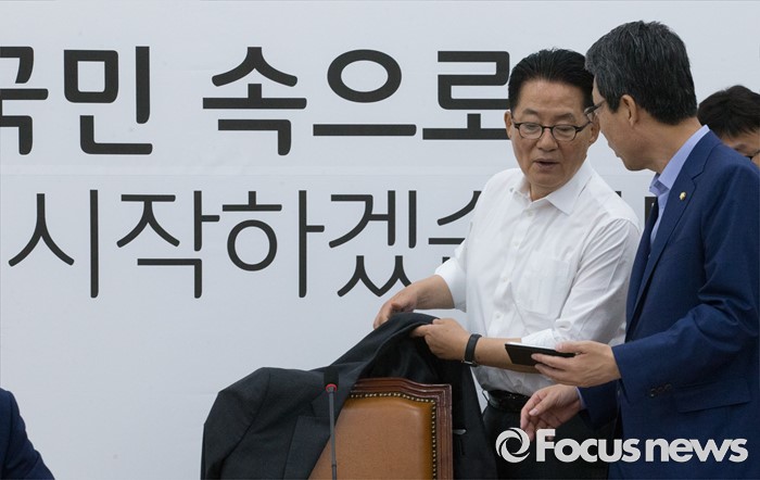 (서울=포커스뉴스) 21일 오전 서울 여의도 국회에서 열린 국민의당 원내정책회의에 참석한 박지원(왼쪽) 비대위원장과 김성식 정책위의장이 당사에서 진행 중인 사드배치 반대 필리버스터 온라인 방송을 핸드폰으로 시청하고 있다.