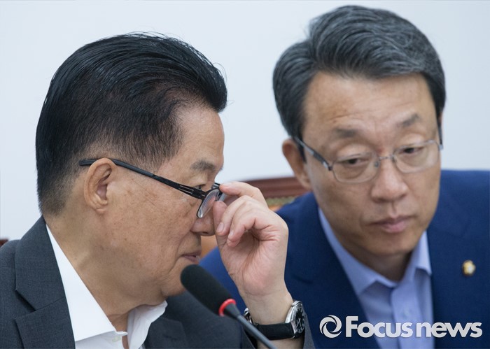 (서울=포커스뉴스) 21일 오전 서울 여의도 국회에서 열린 국민의당 원내정책회의에 참석한 박지원(왼쪽) 비대위원장과 김성식 정책위의장이 대화하고 있다.