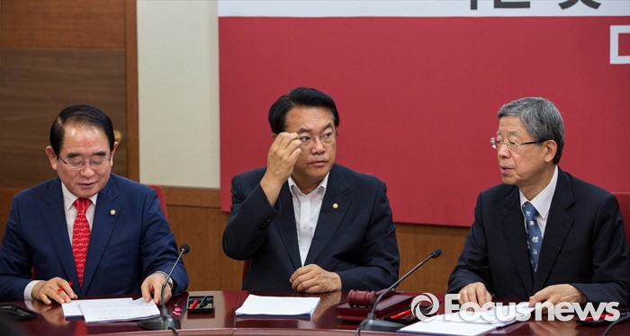 (서울=포커스뉴스) 새누리당 지도부가 21일 오전 서울 여의도 새누리당사에서 열린 혁신비상대책위원회의에 참석해 대화 하고 있다. 왼쪽부터 박명재 사무총장, 정진석 원내대표, 김희옥 혁신비대위원장.