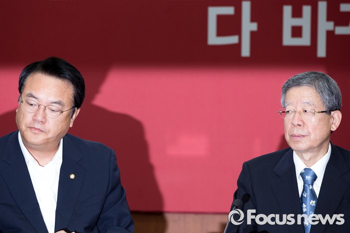 (서울=포커스뉴스) 김희옥(오른쪽) 새누리당 혁신비상대책위원장과 정진석원내대표가 21일 오전 서울 여의도 새누리당사에서 열린 혁신비상대책위원회의에 참석하고 있다.