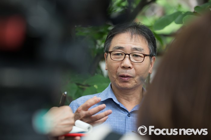 (서울=포커스뉴스) 이기열 원폭피해자가 21일 오전 서울 양천구 서울남부지방법원에서 열린 국가를 상대로 한 손해배상 청구 소송 선거공판이 끝난 뒤 취재진 질문에 답하고 있다. 서울남부지법 민사합의15부(부장판사 이광영)는 한국원폭피해자협회 서울지부 회원 230명이 국가를 상대로 낸 손해배상 청구 소송에서 원고 패소로 판결했다.