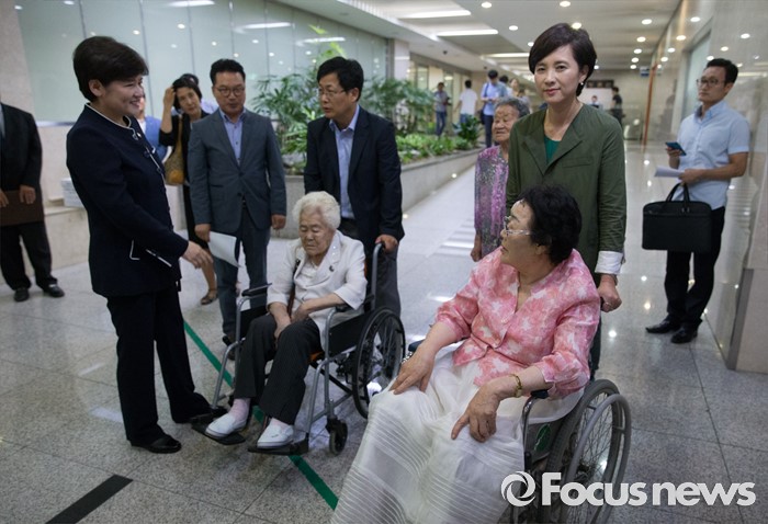 (서울=포커스뉴스) 21일 오전 서울 여의도 국회 정론관 앞에서 위안부 특별법 입법 청원 기자회견에 나서는 유은혜 더불어민주당 의원, 최성 고양시장, 이용수, 박옥선, 이옥선 할머니 등과 강은희 여성가족부 장관이 대화하고 있다.