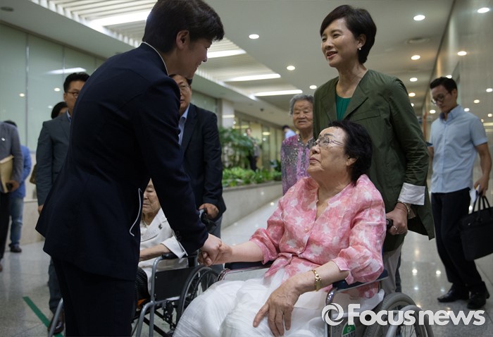 (서울=포커스뉴스) 21일 오전 서울 여의도 국회 정론관 앞에서 위안부 특별법 입법 청원 기자회견에 나서는 유은혜 더불어민주당 의원, 최성 고양시장, 이용수, 박옥선, 이옥선 할머니 등과 강은희 여성가족부 장관이 대화하고 있다.