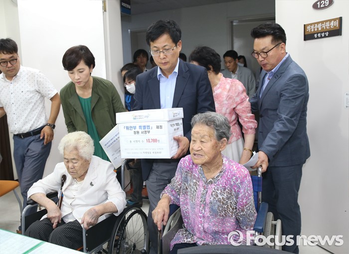 (서울=포커스뉴스) 21일 오전 서울 여의도 국회 정론관에서 유은혜 더불어민주당 의원, 최성 고양시장, 이용수, 박옥선, 이옥선 할머니 등이 위안부 특별법 입법 청원 기자회견을 마친 뒤 민원실을 찾아 청원서를 제출하고 있다.
