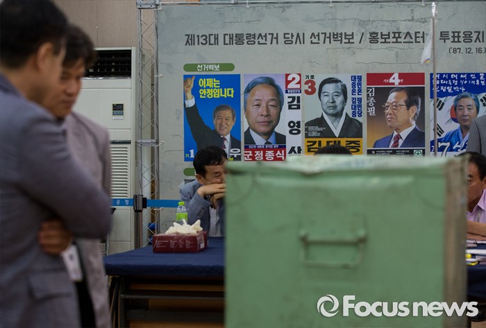 (서울=포커스뉴스) 20일 오전 서울 종로구 선거연수원에서 공개된 1987년 제13대 대통령선거 구로구을 우편투표함 뒤로 당시 선거벽보들이 전시돼 있다.