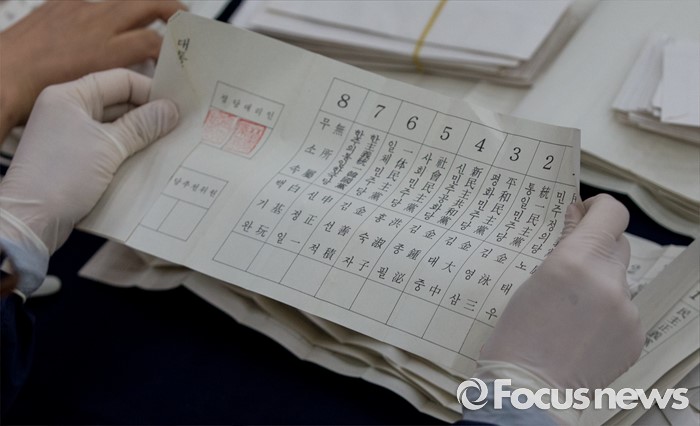 (서울=포커스뉴스) 20일 오전 서울 종로구 선거연수원에서 개표사무원들이 1987년 제13대 대통령선거 구로구을 우편투표함에서 꺼낸 투표용지를 계수하고 있다.