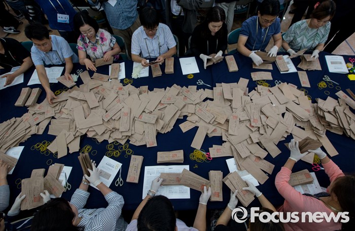 (서울=포커스뉴스) 20일 오전 서울 종로구 선거연수원에서 개표사무원들이 1987년 제13대 대통령선거 구로구을 우편투표함에서 꺼낸 투표용지를 계수하고 있다.