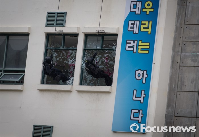 (서울=포커스뉴스) 21일 오전 서울 서초구 경찰특공대에서 경찰 특공대원들이 대테러 훈련을 하고 있다.