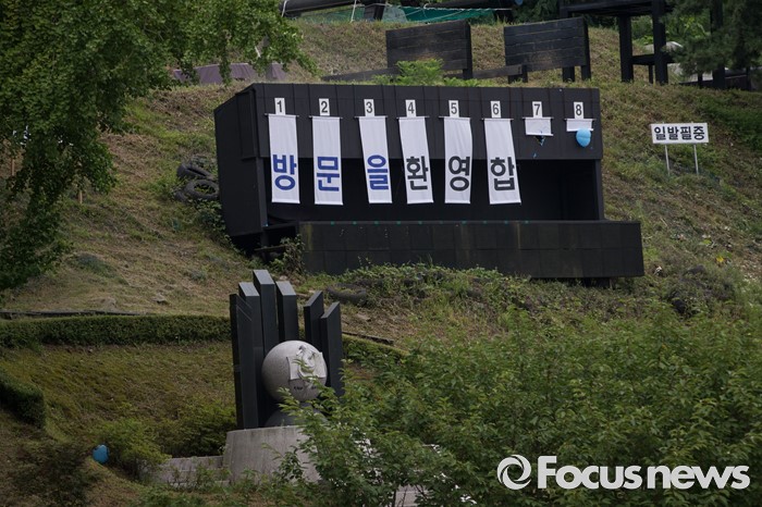 (서울=포커스뉴스) 김종인 더불어민주당 비상대책위원회 대표와 안전행정위원들이 21일 오전 서울 서초구 경찰특공대를 방문해 대테러 훈련 시범을 참관하고 있다. 경찰특공대 저격수가 사격한 풍선에 '방문을 환영합니다'라고 적힌 글씨가 보이고 있다.