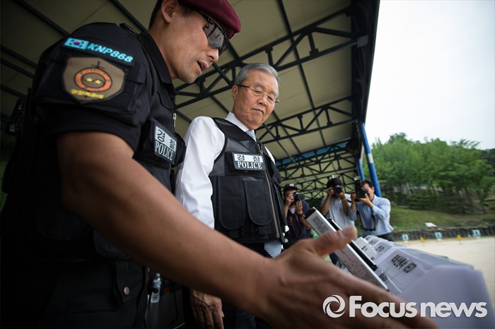 (서울=포커스뉴스) 김종인 더불어민주당 비상대책위원회 대표가 21일 오전 서울 서초구 경찰특공대를 방문해 대테러 훈련 시범을 참관하며 사제 폭발물 폭파 작동을 체험하고 있다.
