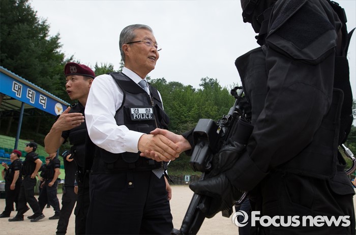 (서울=포커스뉴스) 김종인 더불어민주당 비상대책위원회 대표가 21일 오전 서울 서초구 경찰특공대를 방문해 대테러 훈련 시범 참관을 마치고 훈련한 경찰특공대원들을 격려하고 있다.