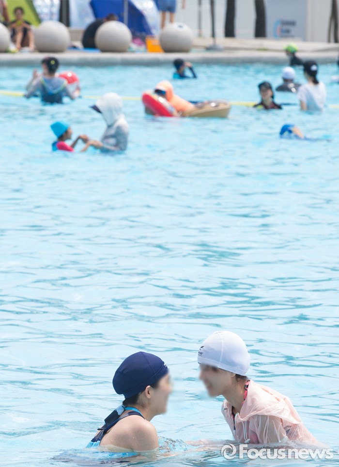 (서울=포커스뉴스) 21일 오후 서울 광진구 뚝섬 한강공원 수영장을 찾은 시민들이 물놀이를 즐기고 있다.