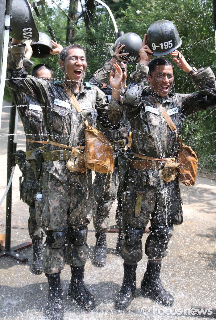 (논산=포커스뉴스) 폭염경보가 발령된 21일 충남 논산 연무읍 육군훈련소 각개전투종합훈련장에서 26교육연대 3교육대 훈련병들이 훈련을 받고 샤워를 하며 더위를 식히고 있다.