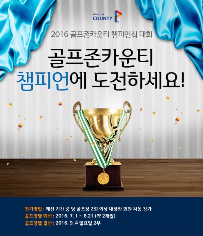 골프존카운티 김준환 대표는 "여름철 무더위에 지치기 쉬운 골퍼들을 위해 다양한 이벤트를 마련했다"며 "이번 이벤트를 통해 한여름 무더위는 잠시 잊고, 건강을 챙기는 기회가 되길 바란다"고 말했다.'2016 골프존카운티 통합 챔피언십 대회' 개최를 알리는 포스터.<사진제공=골프존카운티>