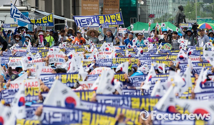 (서울=포커스뉴스) 21일 오후 서울역 광장에서 사드 배치 반대를 요구하는 경북 성주군민 2천여 명이 대규모 상경집회를 하고 있다.