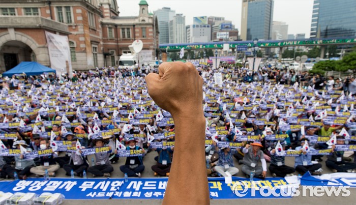 (서울=포커스뉴스) 21일 오후 서울역 광장에서 사드 배치 반대를 요구하는 경북 성주군민 2천여 명이 대규모 상경집회를 하고 있다.