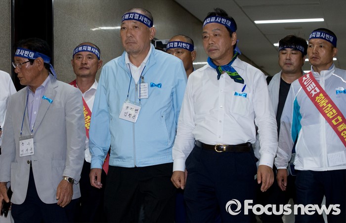 (서울=포커스뉴스) 21일 오후 서울 여의도 국회에서 이완영 새누리당 의원과 김항곤 성주군수 등 성주 사드배치 저지 투쟁위원회 관계자들이 정진석 원내대표 등 지도부와의 면담을 위해 원내대표실로 향하고 있다.