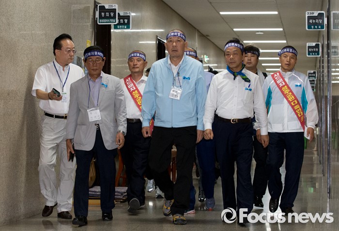 (서울=포커스뉴스) 21일 오후 서울 여의도 국회에서 이완영 새누리당 의원과 김항곤 성주군수 등 성주 사드배치 저지 투쟁위원회 관계자들이 정진석 원내대표 등 지도부와의 면담을 위해 원내대표실로 향하고 있다.