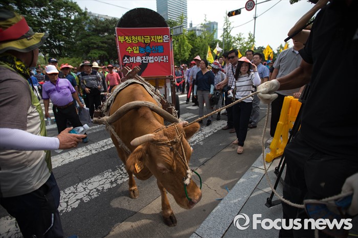 (서울=포커스뉴스) 21일 오후 서울 여의도 산업은행 본점 앞에서 농축산물의 김영란법 적용 제외를 요구하는 전국 농축산인 총궐기대회가 열리고 있다.