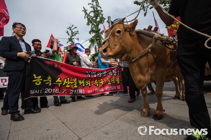 (서울=포커스뉴스) 21일 오후 서울 여의도 산업은행 본점 앞에서 농축산물의 김영란법 적용 제외를 요구하는 전국 농축산인 총궐기대회가 열리고 있다.