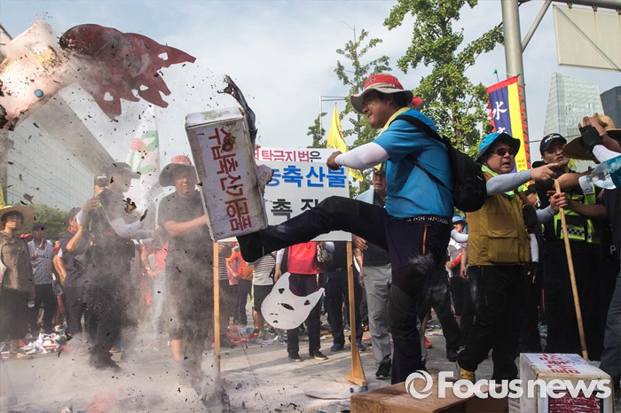 (서울=포커스뉴스) 21일 오후 서울 여의도 산업은행 본점 앞에서 농축산물의 김영란법 적용 제외를 요구하는 전국 농축산인 총궐기대회가 열리고 있다.