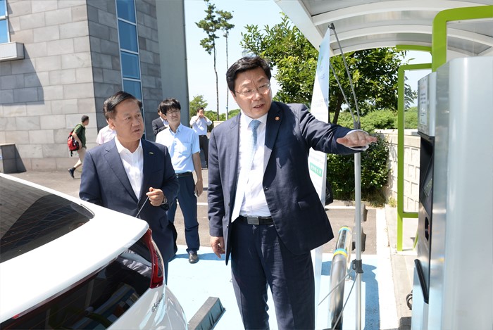 | △ 전기차 충전현장 둘러보는 주형환 장관 |