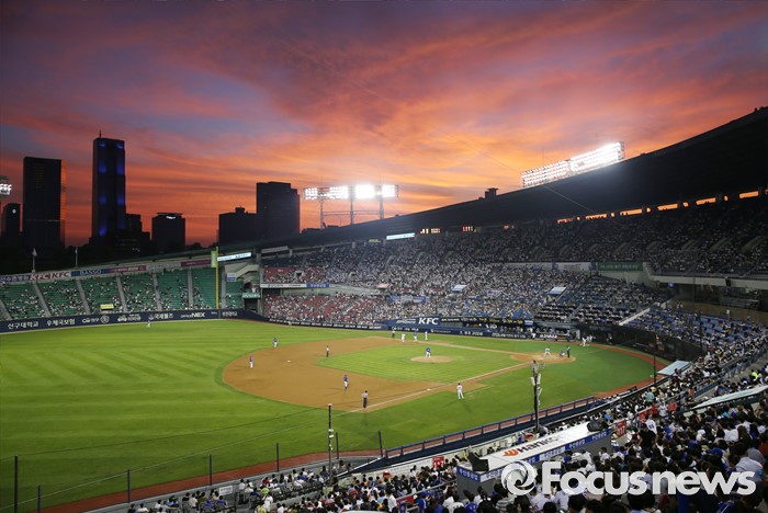 (서울=포커스뉴스) 21일 2016 프로야구 삼성-두산 경기가 열린 서울 잠실구장을 덮은 빨간 노을이 박진감 있는 경기와 더불어 또 하나의 아름다움을 관중들에게 선사하고 있다.