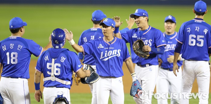 (서울=포커스뉴스) 21일 서울 잠실구장에서 열린 2016 프로야구 삼성-두산 경기에서 두산에 이틀 연속 승리한 삼성 선수들이 마운드에 모여 하이파이브하며 함꼐 기뻐하고 있다.