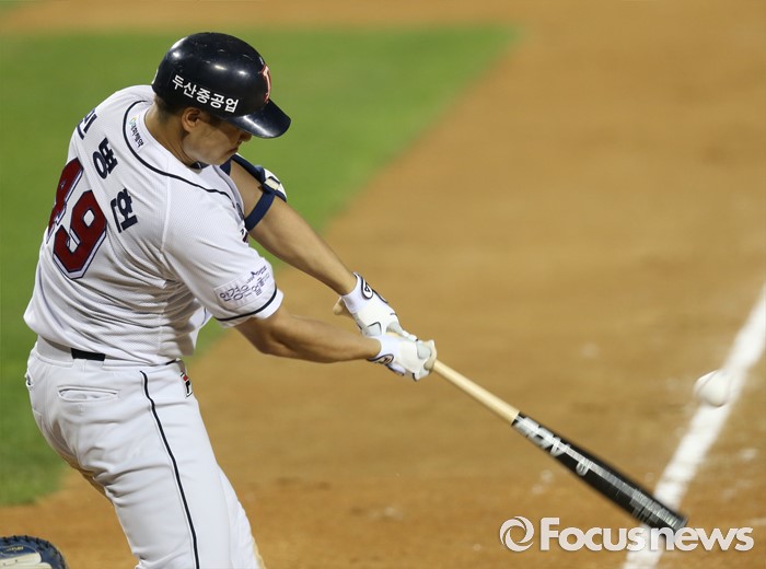 (서울=포커스뉴스) 21일 서울 잠실구장에서 열린 2016 프로야구 삼성-두산 경기에서 두산 민병헌이 7회말에 타격하고 있다.