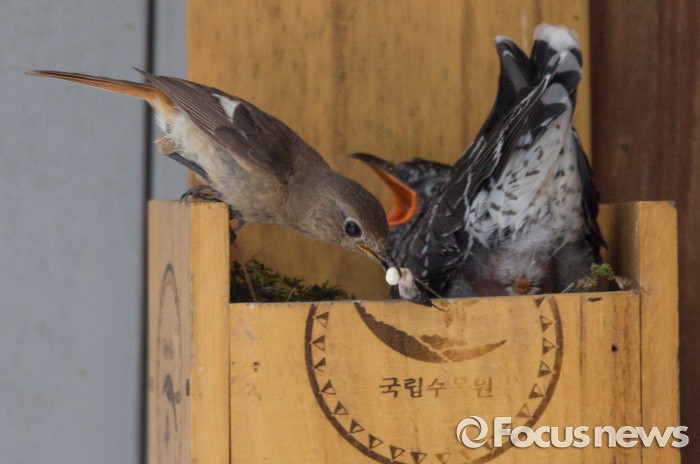 (포천=포커스뉴스) 딱새(왼쪽)암컷이 21일 국립수목원 광릉숲에서 자신이 양육한 뻐꾸기 새끼의 배설물을 청소하고 있다.
