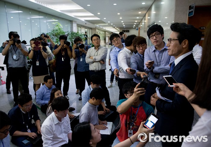 (서울=포커스뉴스) 전당대회 출마를 선언한 정병국 새누리당 의원이 22일 오전 서울 여의도 국회 정론관에서 우병우 청와대 민정수석 사퇴 촉구 및 야당 사드배치 반대 주장 중단 등 현안 관련 기자회견을 마친 뒤 취재진 질문에 답하고 있다.