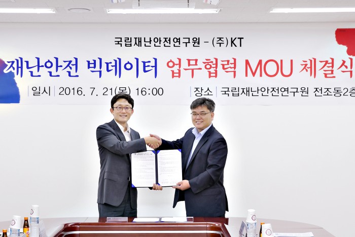(서울=포커스뉴스) KT와 국립재난안전연구원이 빅데이터를 기반으로 한 재난대응 전략을 세우기 위해 손을 잡았다. KT와 국립재난안전연구원은 21일 울산에 위치한 국립재난안전연구원에서 재난안전 빅데이터 활용 연구협력 체계 구축을 위한 업무협약(MOU)을 체결했다.