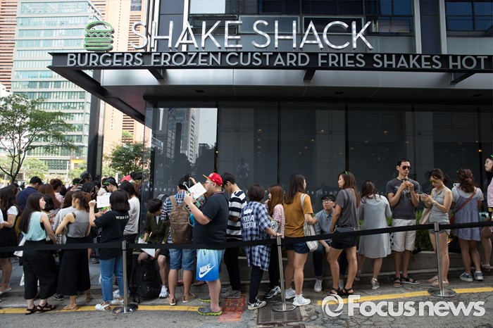 (서울=포커스뉴스) 22일 오전 서울 강남구 쉐이크쉑 국내 1호점 매장 앞에 시민들이 오픈을 앞두고 줄을 서고 있다.