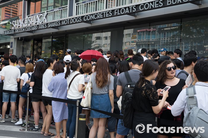 (서울=포커스뉴스) 22일 오전 서울 강남구 쉐이크쉑 국내 1호점 매장 앞에 시민들이 오픈을 앞두고 줄을 서고 있다.