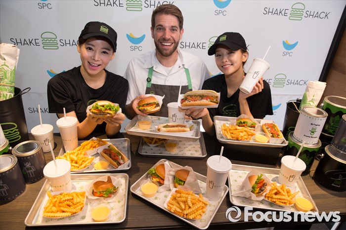 (서울=포커스뉴스) 22일 오전 서울 강남구 쉐이크쉑 국내 1호점 매장에서 쉐이크쉑 푸드 디렉터 마크 로사티(가운데)와 모델들이 제품을 선보이고 있다. 기본 버거인 쉑버거 단품이 6900원, 슈룸버거 단품 9400원, 감자튀김 3900원, 쉐이크 음료가 5900원이다.