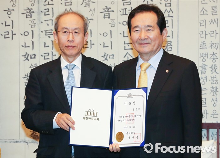 (서울=포커스뉴스) 22일 오전 서울 여의도 국회 의장접견실에서 열린 국회 공직자윤리위원회 위촉식에 참석한 정세균(오른쪽) 국회의장이 윤성식 위원장에게 위촉장을 수여한 뒤 포즈를 취하고 있다.