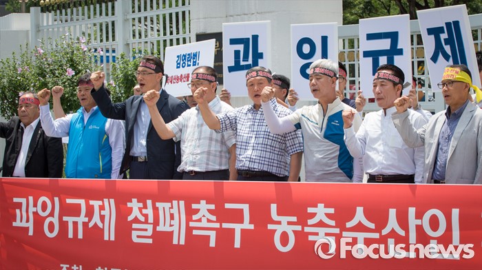 (서울=포커스뉴스) 22일 오후 서울정부청사 앞에서 열린 과잉규제 철폐촉구 농수축산인 기자회견에 참석한 한국농축산연합회 회원들이 김영란법을 반대하는 구호를 외치고 있다.