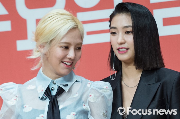 (서울=포커스뉴스) 22일 오후 서울 영등포구 63스퀘어에서 열린 Mnet '힛 더 스테이지' 제작발표회에 참석한 가수 효연(왼쪽)과 보라가 포토타임을 갖고 있다,
