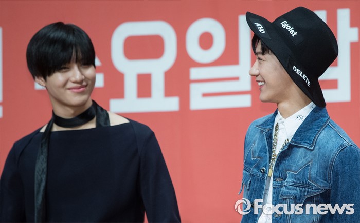 (서울=포커스뉴스) 22일 오후 서울 영등포구 63스퀘어에서 열린 Mnet '힛 더 스테이지' 제작발표회에 참석한 가수 태민(왼쪽)과 텐이 포토타임을 갖고 있다,