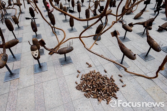 (서울=포커스뉴스) 22일 오후 서울 중구 서울광장에서 '전쟁 없는 세상을 위한 에이이브이(Art's Eye View) 프로젝트 전시가 열리고 있다. 미공군의 사격장으로 쓰였던 경기도 매향리에서 반출된 포탄 및 탄피를 활용, 1000여점의 예술작품으로 만든 이번 전시는 오는 24일까지 열릴 예정이다.