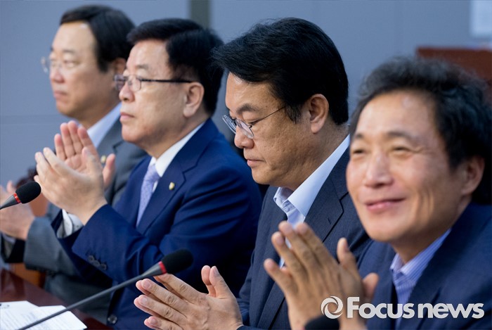 (서울=포커스뉴스) 22일 오후 서울 여의도 국회 의원회관에서 열린 '격차해소를 위한 해법, 왜 중향평준화인가?' 세미나에 참석한 이학재(오른쪽부터) 새누리당 정책위 일자리특위 위원장, 정진석 원내대표, 김광림 정책위의장, 김종석 여의도연구원장이 박수치고 있다.