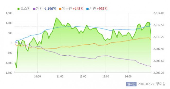 이날 코스피는 전일 대비 0.34% 하락한 2005.37로 장을 시작했다. 장중 2002.66까지 밀렸지만 기관의 매수세에 2010선을 지켜냈다.