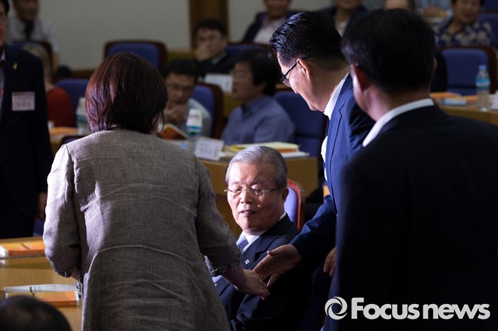 (서울=포커스뉴스) 야3당 대표가 22일 오후 서울 여의도 국회의원회관에서 열린 '5.18 왜곡 방지와 관련 법안 개정(처별규정) 위한 국민 토론회'에 참석해 인사 하고 있다. 왼쪽부터 심상정 정의당 상임대표, 김종인 더불어민주당 비상대책위 대표, 박지원 국민의당 비상대책위원장.