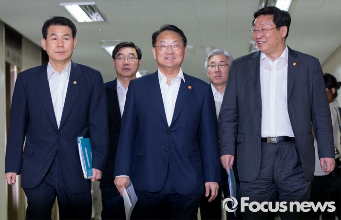 (서울=포커스뉴스) 22일 오후 서울정부청사에서 열린 2016년 추경예산안 합동브리핑에 유일호 경제부총리 겸 기획재정부 장관을 비롯한 장관들이 참석하고 있다. 앞줄 왼쪽부터정은보 금융위원회 부위원장, 이기권 고용노동부 장관, 부총리, 김종덕 문화체육관광부 장관, 주형환 산업통상자원부 장관.