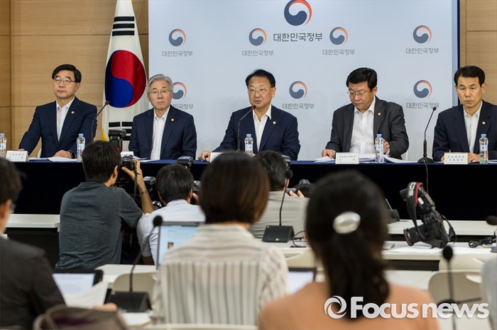 (서울=포커스뉴스) 22일 오후 서울정부청사에서 열린 2016년 추경예산안 합동브리핑에 참석한 유일호 경제부총리 겸 기획재정부 장관이 올해 추경예산 규모를 밝히고 있다. 왼쪽부터 이기권 고용노동부 장관, 김종덕 문화체육관광부 장관, 부총리, 주형환 산업통상자원부 장관,정은보 금융위원회 부위원장.